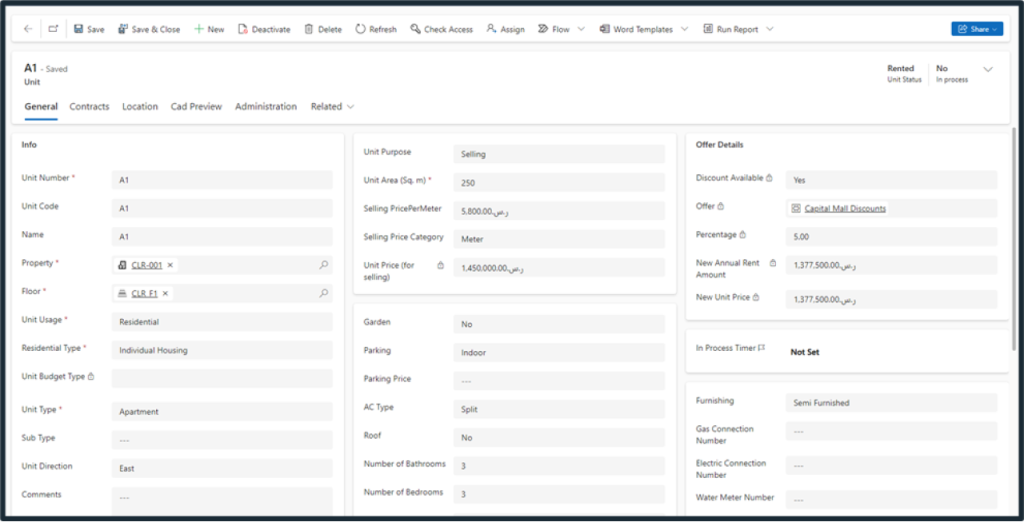 In Property Management you can maintain all your properties with its details by using up to Four levels in the property hierarchy such as Project, Building, and Units.